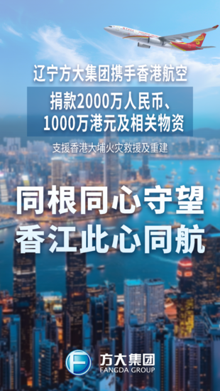 11月26日下午,香港新界大埔屋邨宏福苑多栋住宅楼发生火灾,造成重大人员伤亡。辽宁方大集团及其在港投资企业香港航空与全港市民同心共情,第一时间启动应急支援,方大慈善基金会捐赠2000万人民币,香港航空捐赠1000万港元及1000条毛毯,用于受灾居民紧急安置、生活物资保障、医疗救助补贴及后续善后安置。