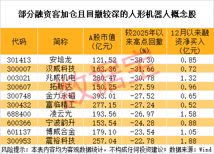 证券时报·数据宝统计,截至12月26日收盘a股杠杆交易平台,12月以来融资净买入超5000万元的人形机器人概念股有23只。这23只人形机器人概念股中,12月26日收盘价与年内高点相比,回撤幅度超20%的有10只。3股回撤幅度超过30%,分别为安培龙、汉威科技、兆威机电。